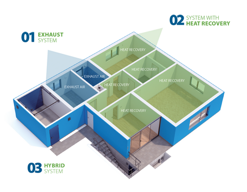 Natural ventilation is hardly possible in such buildings, so an efficient ventilation system is crucial for adequate air exchange. Our ventilation technology makes it possible to ensure a continuous and efficient exchange of air even when people are absent during the day.
